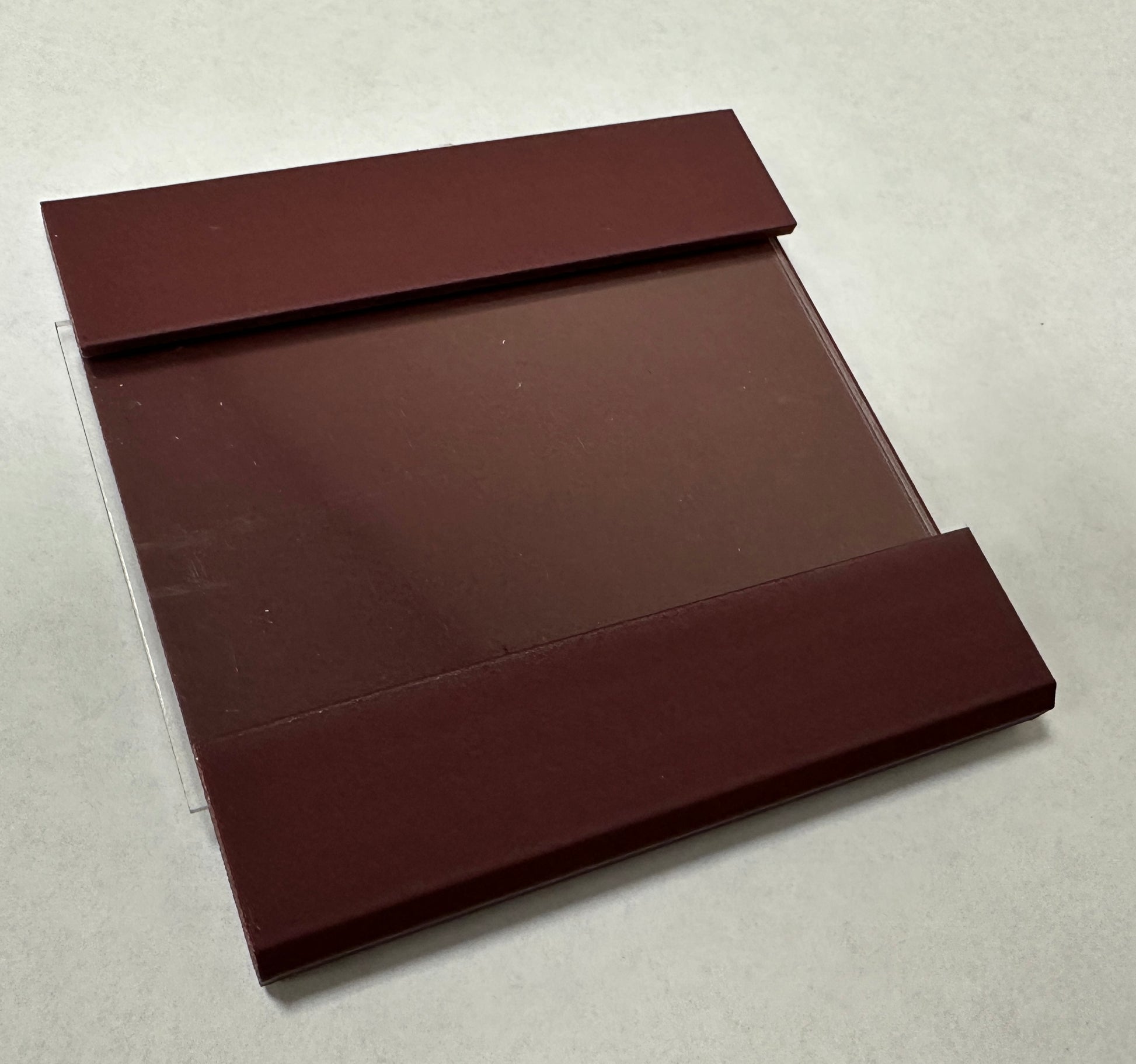 A four inch square, custom made, name plate with clear acrylic window, complete with double stick mounting tape on the back.